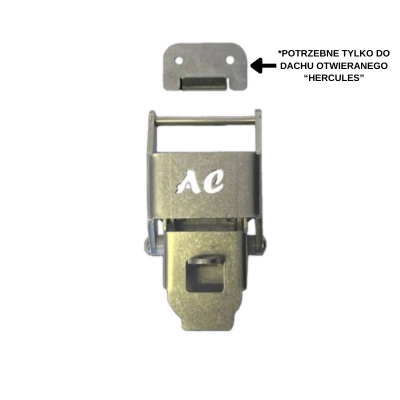 - Komplet dwóch zatrzasków z klamrą, pasujących do namiotów dachowych i zabudów Alu-Cab. W zestawie także zapadka – potrzebna tylko przy montażu do zabudowy Hercules. Do innych modeli wystarczy sam zatrzask.